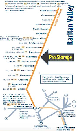 your car. Our monthly charges starts at: * Vehicles Up to 180 in total length: $225 plus NJ sales tax * Vehicles from 181" to 197" in total length: $250 plus NJ sales tax * Vehicles from 198" to 225" in total length: $275 plus NJ sales tax This includes electric for your trickle charger, Seasonal, long or short terms available, stay a month or stay a year. Seasonal storage spaces available first come basis only so come early. We are located on the borders of Union, Somerset and Middlesex Counties in Plainfield New Jersey. Our location is Just 5 miles from route 287 exit 5 * Just 3 miles from route 78 exit 40 * Just 1 mile from route 22 Somerset St.(VIP Honda) Centrally located in Downtown Plainfield on Park Avenue directly across from NJ transit Raritan Valley line train station, newer nice area. No need for a second driver to follow you to drop off or pickup your car, just jump on the train. The storage garage is part of a updated residential/commercial complex. Call or email about our vehicle storage center located at 310 Park Avenue at "The Garage" On-line registration and payment forms available, reserve your spot today. Go to: prostoragenj.com ***Assistance with online applications please call or text 908-625-8353 *** *0ver 180" Up-charge. No ride? Pro Storage is conveniently accessible from all NJ transit services!